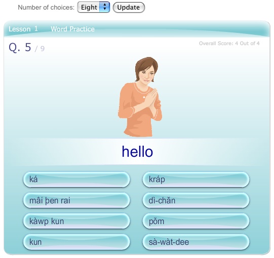 New Media Tab in LessonsFebruary 5, 2010We have created a 5th lesson tab -- called "Media" -- that will contain downloads and videos for each lesson. The downloads include a printable PDF version of the lesson, as well as PDF flashcards that you can print out and study anywhere. The videos are screen captures of the games, and are a great way to review the words in each lesson. All of the lessons should have the PDFs available now, and we are currently adding the videos to each lesson as well. So check out the "Media" tab in each lesson to find other resources to help you learn Thai, both online and offline! |