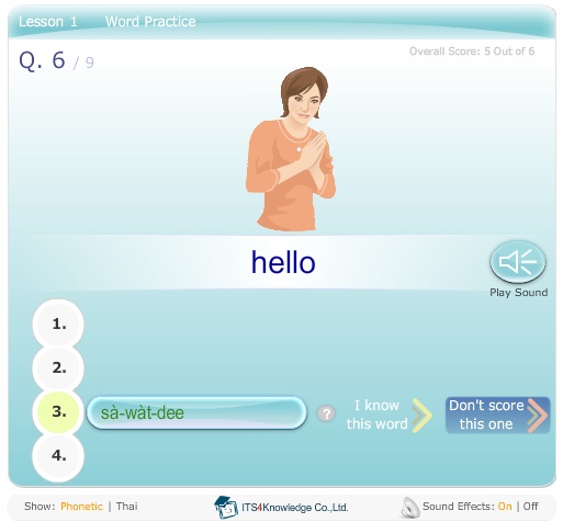 Scoring Guesses in the Word Practice GameAugust 23, 2008When doing multiple-choice quizzes like the Word Practice Game in the Conversation and Vocabulary Courses, sometimes you might take a wild guess and still get the right answer. (You have a 25% chance, afterall.) But if you just guessed correctly, does that mean that you now know the word? It might be a good idea to practice that word again. To help you with this, after every question you answer correctly, you have the choice between not counting the score, or telling ITS4Thai that you are confident that you know the answer. If you guessed or are not sure about the answer, you can click the "Don't Score This" button. If you are confident that you knew the answer all along, you can click the "I know" button. Clicking the "Don't Score This" button will allow you to see the word and practice it again at the end of the game. This repetition will help cement the meaning of the word in your long-term memory. And if you don't want to worry about this distinction, then you can click on "I Know This Word" or just hit the space bar every time to advance to the next question. Here's what the new feature looks like: ![]() |