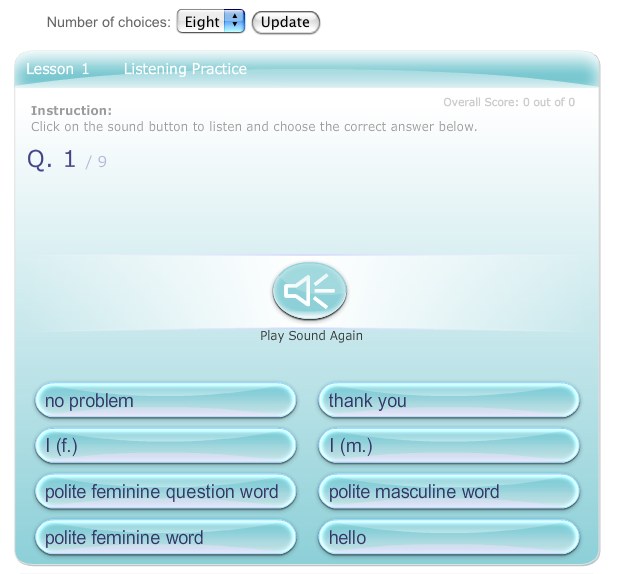 Control the Number of Choices in the Listening GameOctober 3, 2008Last month we gave you the ability to choose the number of word choices you get in the Word Practice game. Now we have extended that functionality to the Listening game as well. The screen shot below shows you what you will see when you play this game. (This is a screen shot image, so you can't actually select or click on the Update button!)